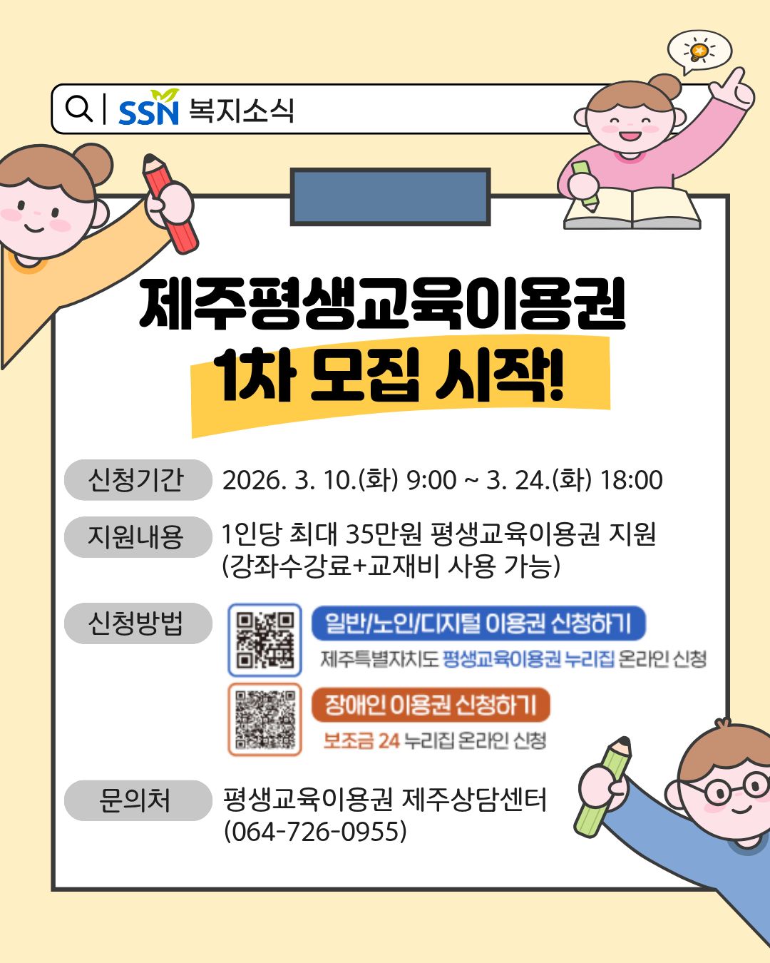 - 장애인 평생교육이용권 : 19세 이상 제주도민 중 등록장애인
