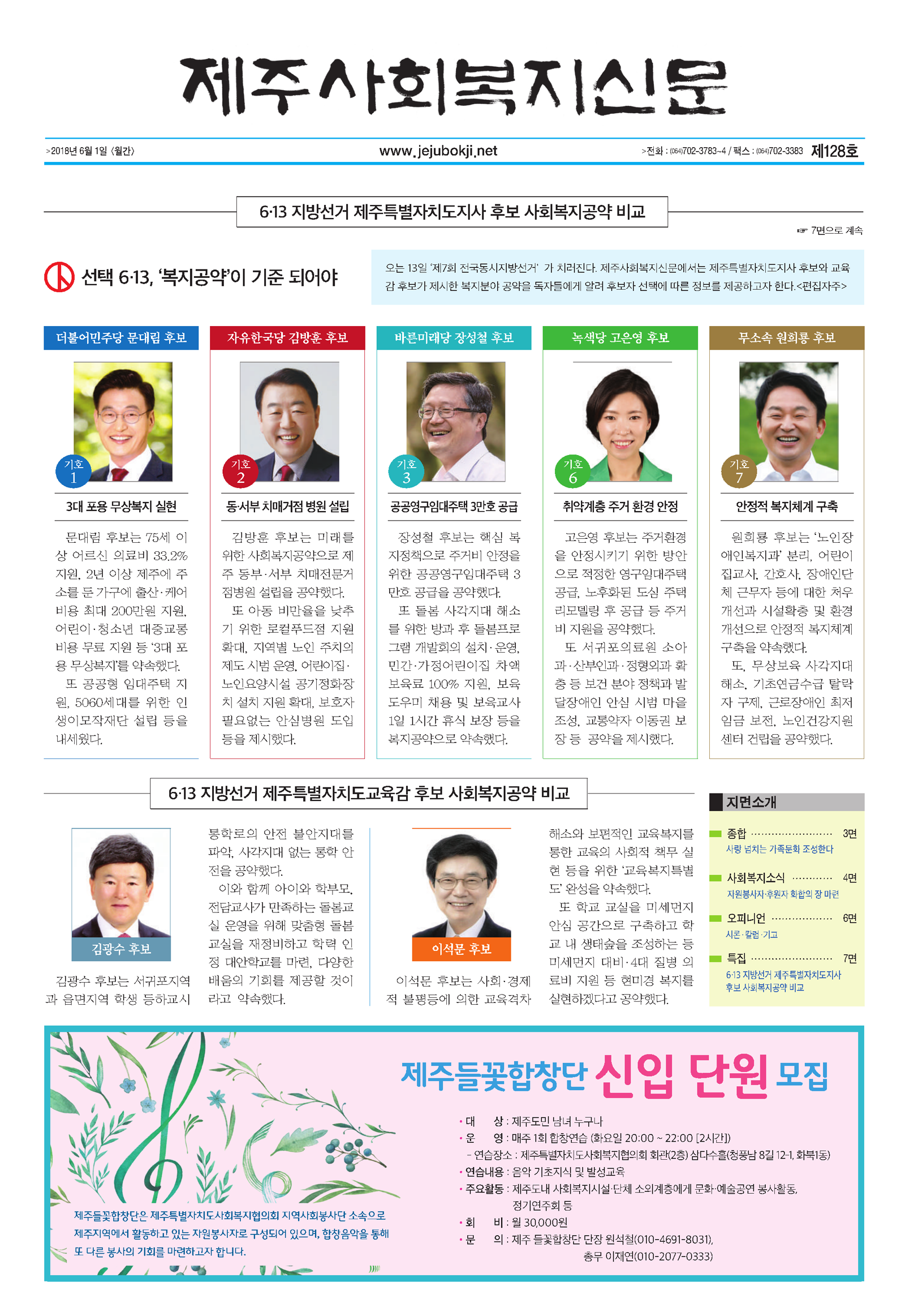 (7면) (특집) 6.13 지방선거 제주특별자치도지사 후보 사회복지공약 비교 (특집) 6·13 지방선거 제주특별자치도교육감 후보 사회복지공약 비교 |