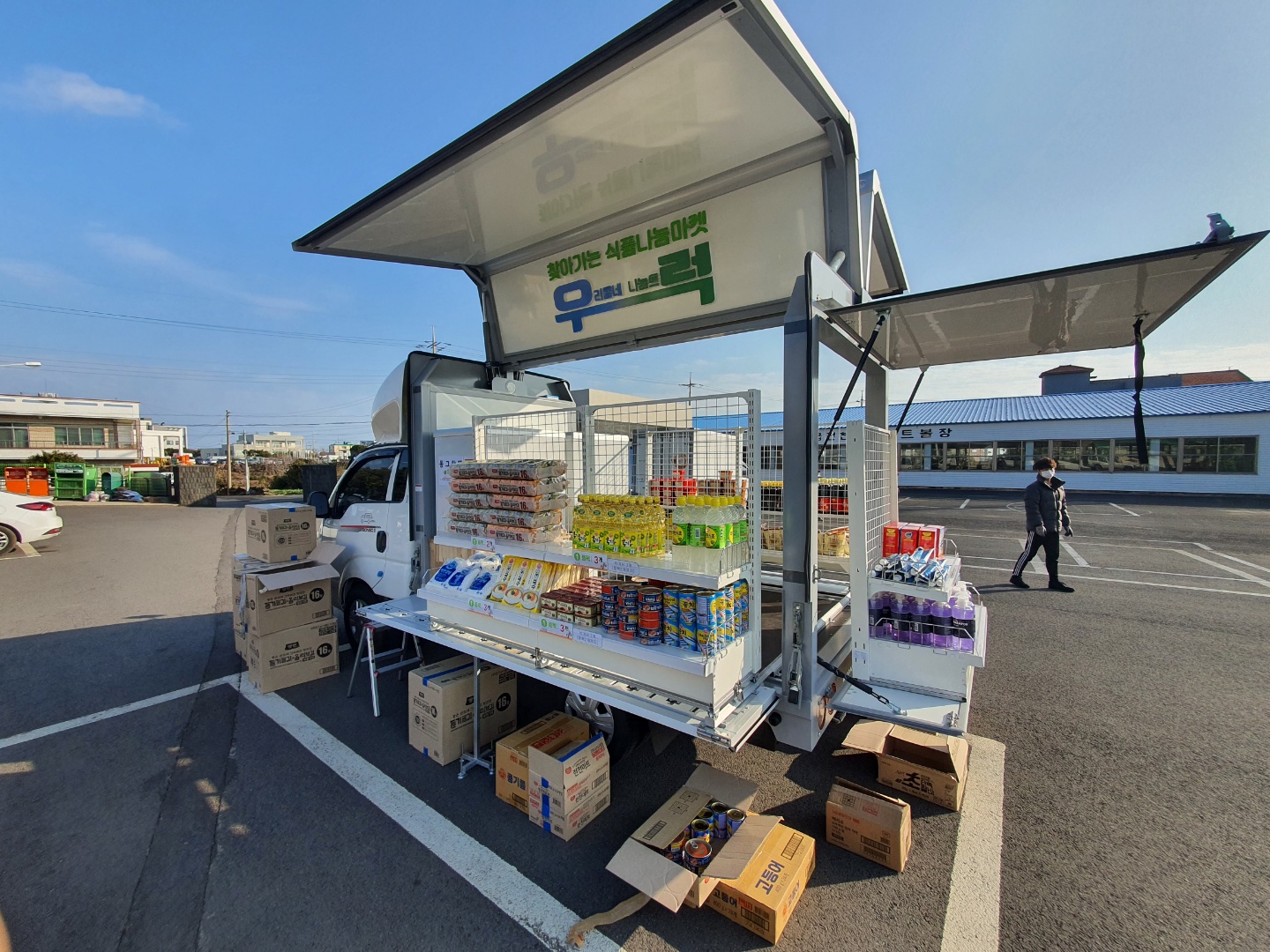어려운 읍면지역 취약계층을 대상으로 직접 찾아가 이동형 편의점(1톤트럭 개조)을 통해 기부