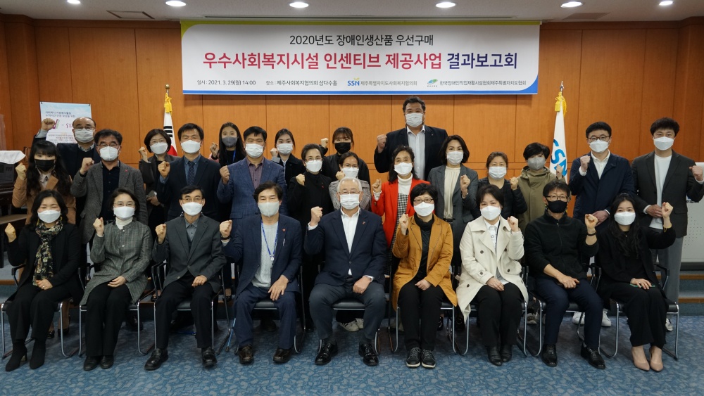 오늘 협의회 2층 삼다수홀에서 '2020년도 장애인생산품 우선구매 우수 사회복지시설 인센티브 제공사업 결과보고회'가 개최되었습니다.