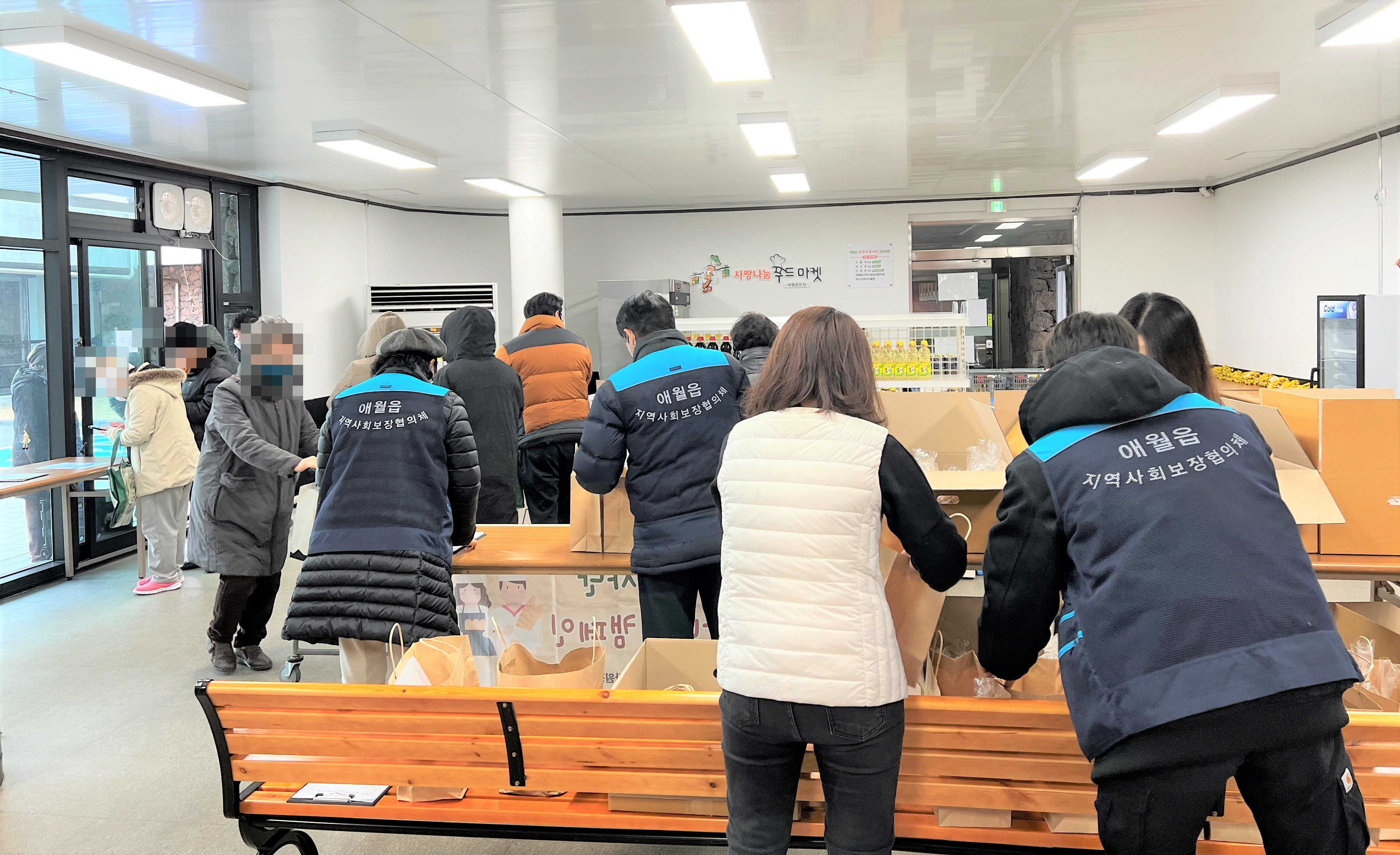 1월28일(금) 제주시 애월읍 애월체육관에서 오전 10시부터 오후 2시까지 사랑나눔푸드마켓 애월분점을 운영하여, 44명의 이용자에게 기부식품과 물품을 제공하였습니다.