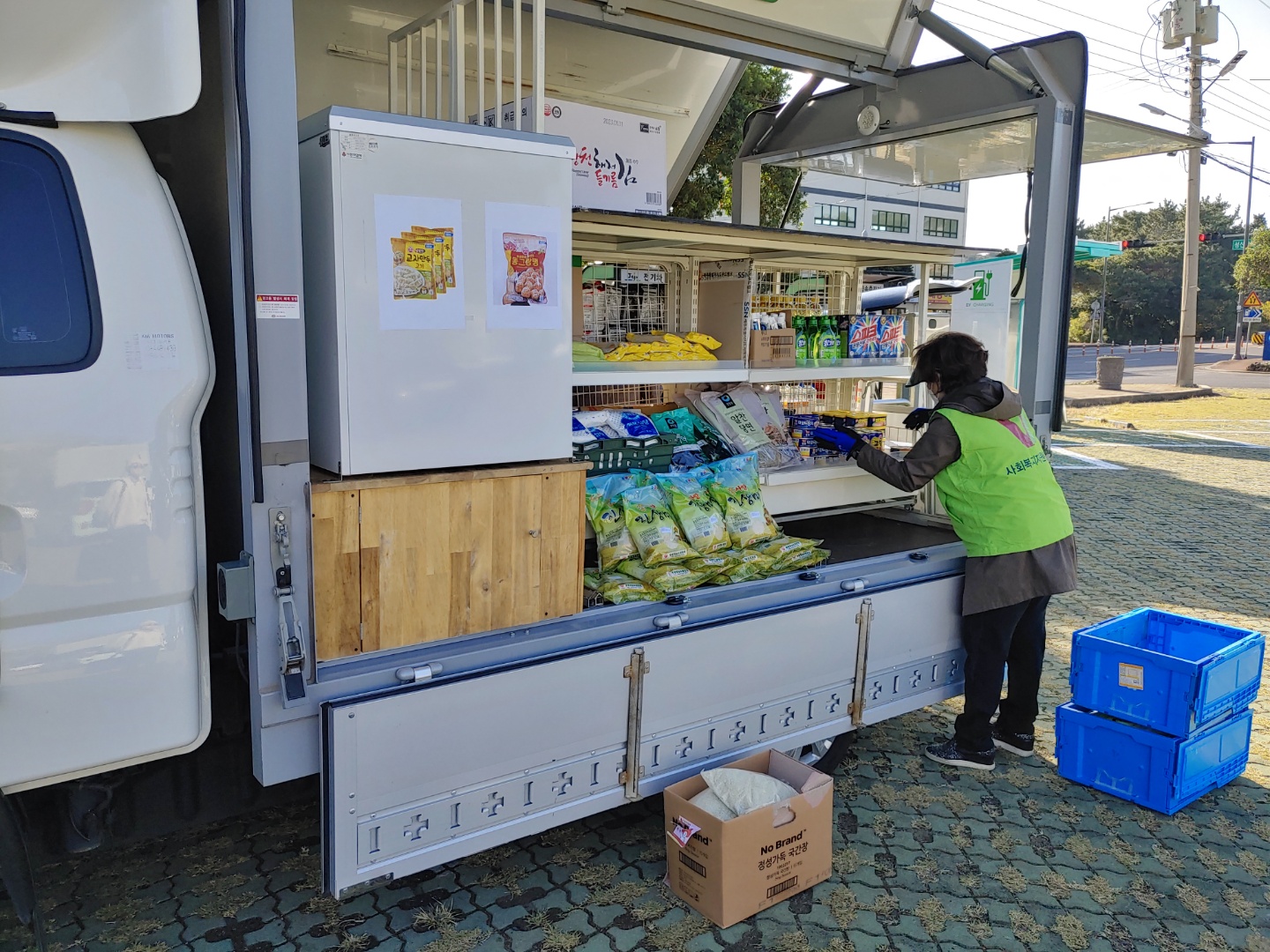 직접 찾아가 이동형 편의점 형태의 차량(1t트럭 개조)을 통해 기부식품을 제공하고