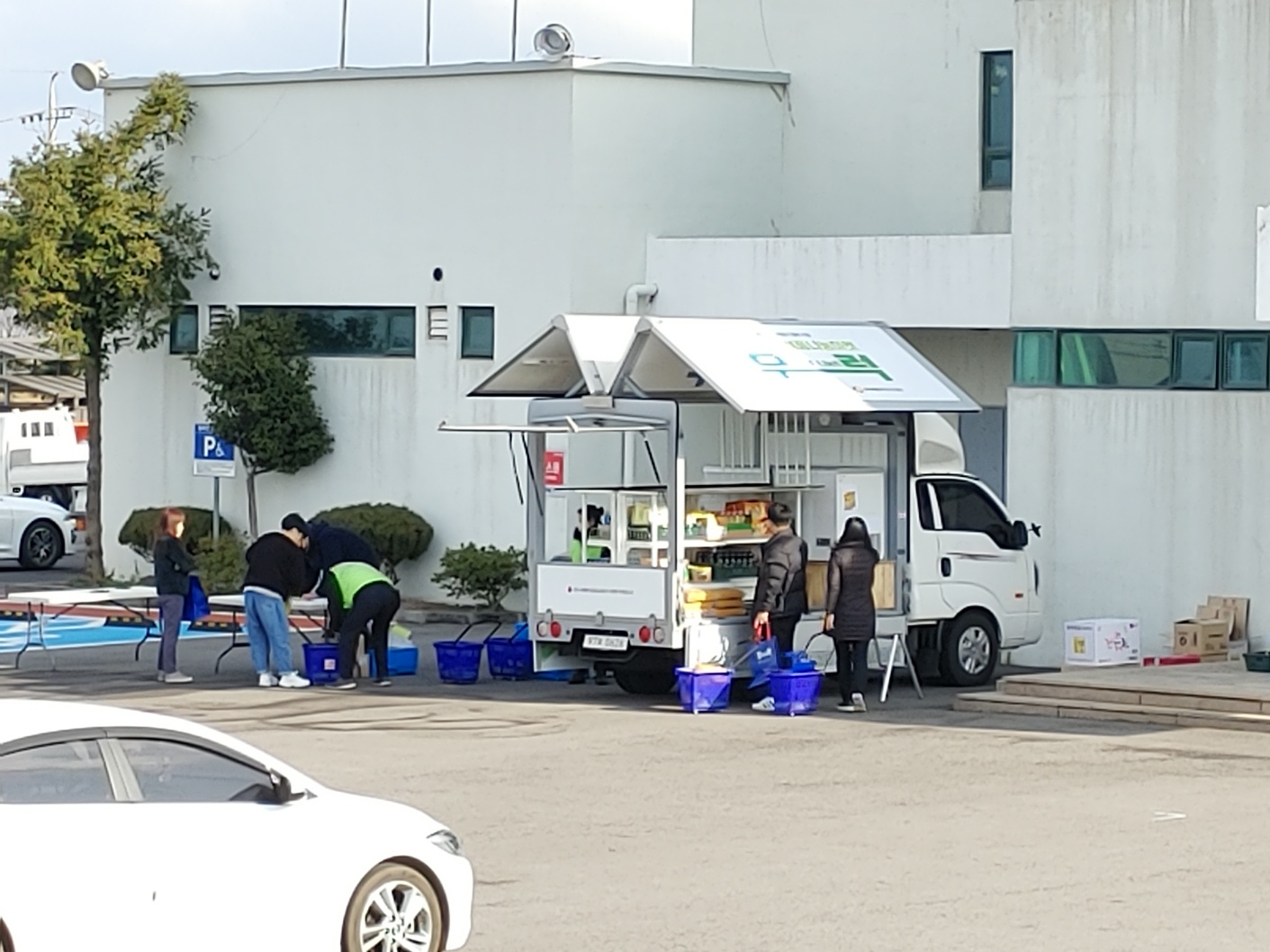 거동이 불편하신 어르신들께서 요양사님들의 차를 타고 오셔서 직접 물품을 고르시는