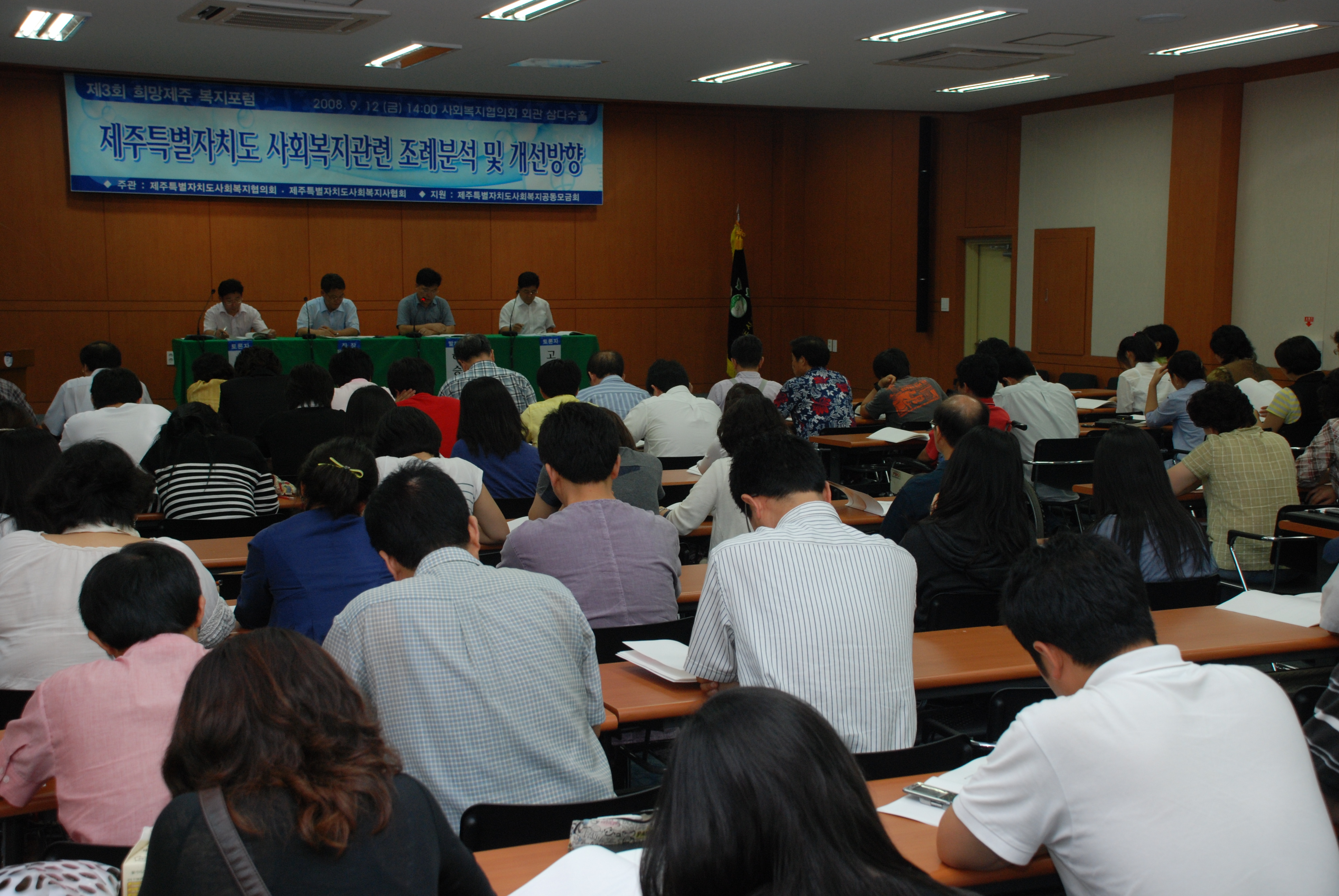지난 9. 12일 제3회 희망제주 복지포럼이 사회복지협의회 회관 2층 삼다수홀에서 개최되었습니다. 이날 포럼에서는 "제주특별자치도 사회복지관련 조례분석 및 개선방향"과 "제주 지역사회에서의 지역자활사업 활성화 방안 모색"이라는 2가지 주제로 개최되어 사회복지근무자 및 관계공무원, 복지관련학과 학생 등 총 117명이 참석하여 성황리에 개최었습니다.