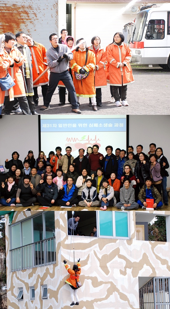 사회복지종사자 재해예방 안전관리 교육이 지난 3. 25일(금) 제주특별자치도소방교육대에서 시행되었습니다. 이 날 참가자들은 농연탈출체험, 소화기(전) 사용실습, 완강기 탈출실습, 심폐소생술 등을 익혔습니다.