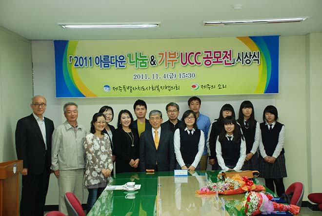 나눔과 기부 환경의 조성 ‧ 확산을 위해 ‘제주특별자치도사회복지협의회’와 ‘제주의소리’가 공동으로 주최한 「2011 아름다운 ‘나눔 & 기부’ UCC 공모전」시상식이 11. 4(금) 우리 협의회에서 있었다.