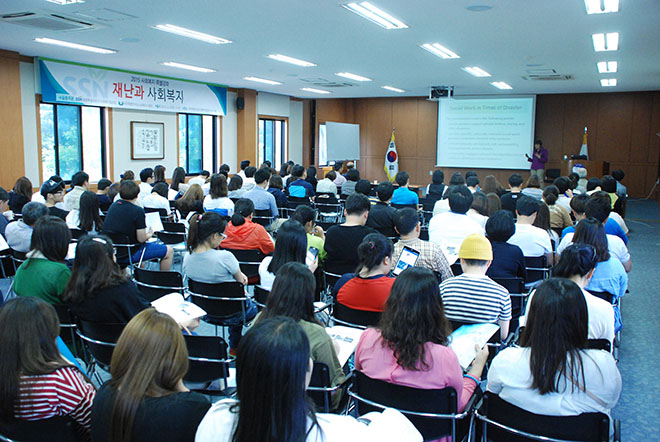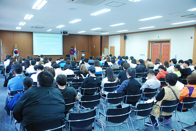 제주특별자치도사회복지협의회(회장 고치환)과 제주특별자치도사회복지사협회(회장 임태봉)은 지난 5월 22일 협의회 삼다수홀(2층)에서 '재난과 사회복지사의 역할'에 대한 특별강좌를 실시하였습니다. 이날 강좌에는 Lena Dominelli(Duham University, UK)교수님께서 다양한 재난사고시 사회복지사의 역할과 방향성에 대하여 강좌를 해주셨습니다. 도내 사회복지시설·단체 선생님들과 제주관광대학교 학생 140여명이 교육에 참가하여 요즘 이슈로 떠오른 재난 시 사회복지사의 역할에 대한 뜨거운 관심을 느낄 수 있는 시간이었습니다.