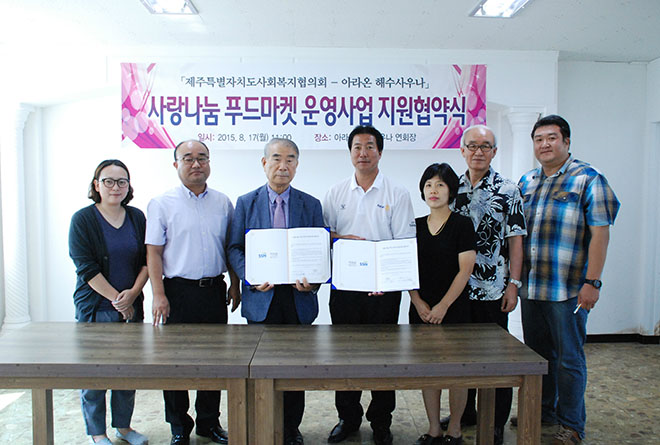 제주특별자치도사회복지협의회(회장 고치환)와 아라온 해수사우나(대표 장승남)가 8월 17일 푸드마켓 운영사업 지원 및 상호협력에 대한 협약을 체결했습니다.