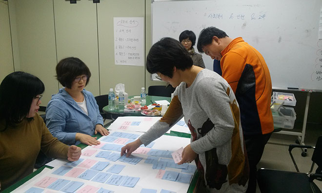 사회복지인권사랑방에서는 2016. 3.25(금) 14:00~17:00까지 사회복지종사자'인권'워크숍개최를 위한 사전기획워크숍이 진행되었습니다. 퍼실리테이션기법을 활용한 기획워크숍으로 사회복지종사자'인권'워크숍의 주제를 정하고, 워크숍이 안전하고 솔직한 이야기의 장을 마련하기 위한 방안등이 논의되었습니다.