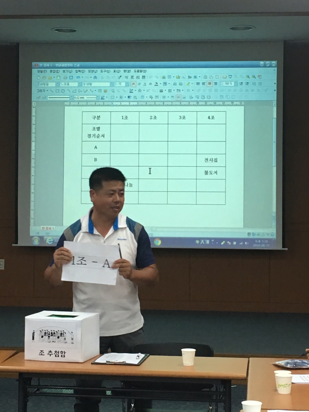 이날 대표자회의에서는 작년 대회 영상을 비롯해 경기 규정설명, 조별추첨 등이 진행되었습니다.