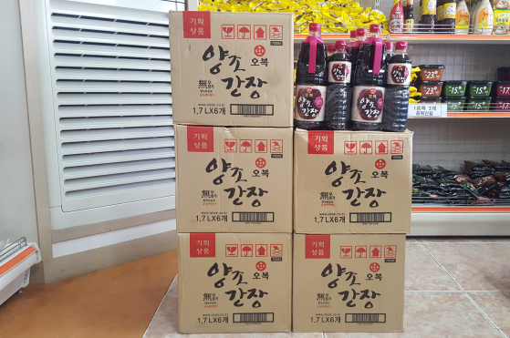 푸드마켓으로 간장 5박스와 낱개로 10개를 직접 사서 기탁해주셨습니다.