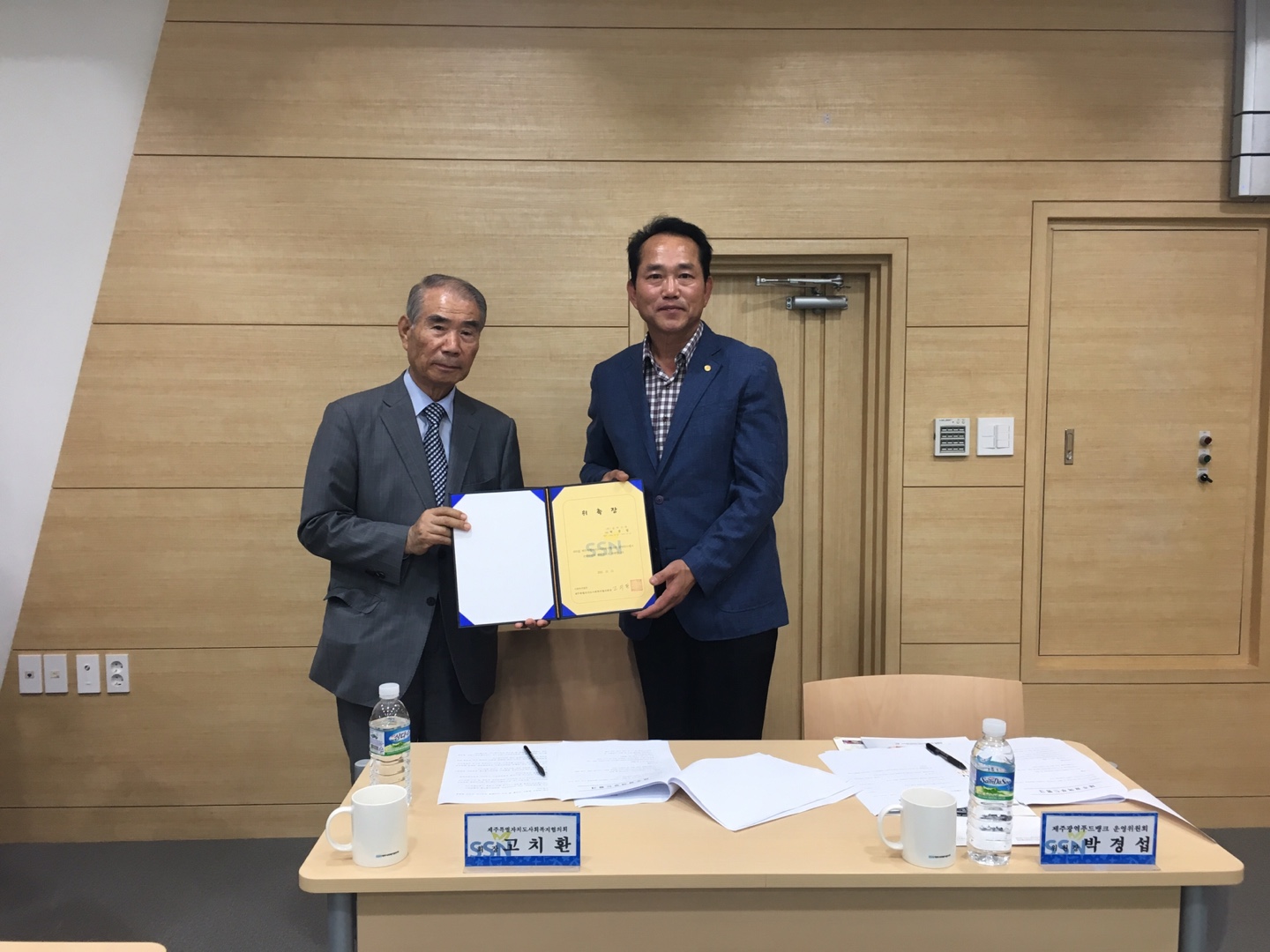 [사진2] 제주특별자치도사회복지협의회 고치환 회장이 박경섭 (주)동부건재 대표에게 위촉장을 건네며 기념촬영을 하고 있다.