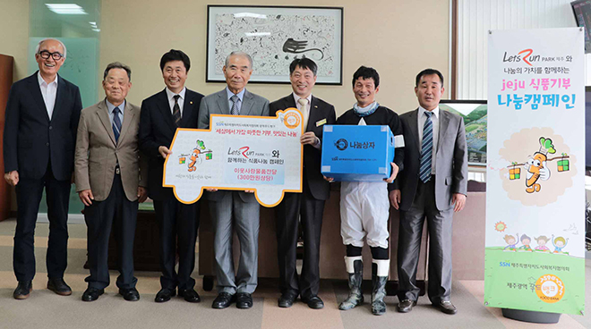 제주특별자치도광역푸드뱅크(고치환 회장) 지난 15(토) 한국마사회 제주본부 경마개최위원장실에서 '레츠런파크제주와 함께하는 식품나눔캠페인'물품전달식이 있었습니다.