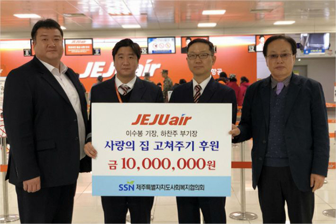 지난 21일 제주국제공항에서 제주항공 이수봉 기장님과 하찬주 부기장님께서 협의회 주거환경 개선 사업에 사용해 달라며 1000만원을 기탁해주셨습니다.