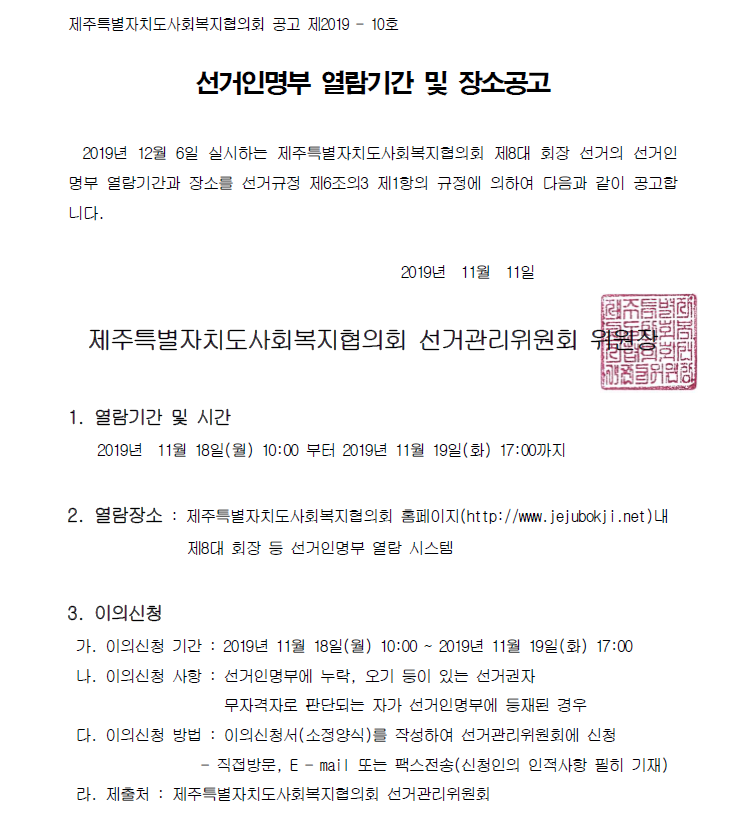 선거인 명부 열람기간 및 장소공고