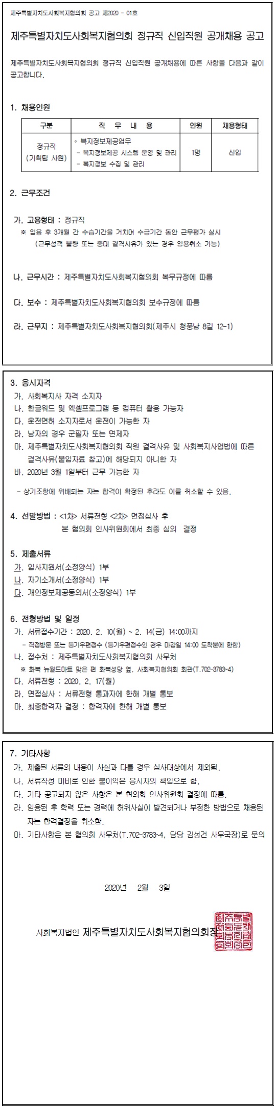 제주특별자치도사회복지협의회 정규직 신입직원 공개채용 공고