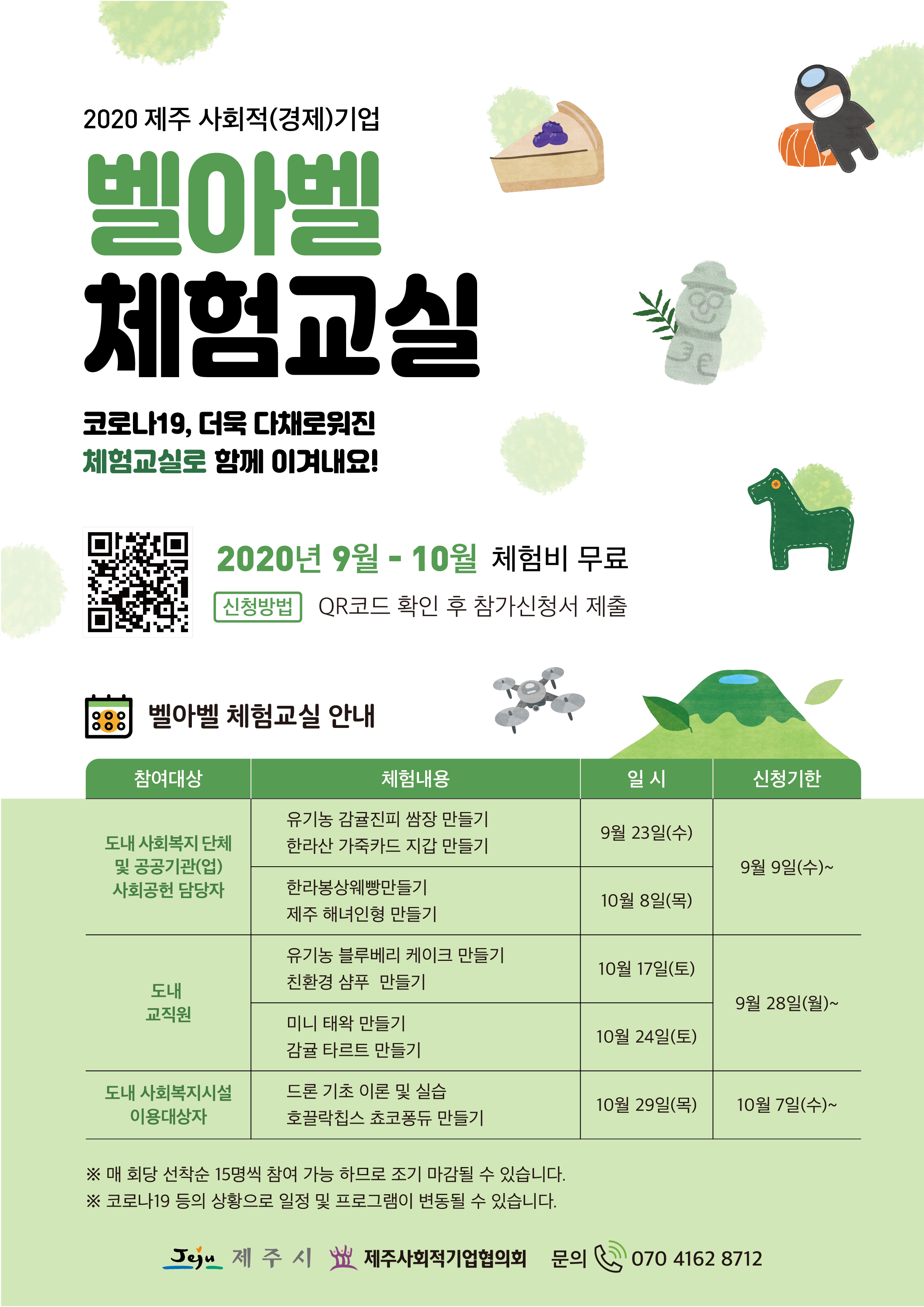 1. 코로나 바이러스 확산으로 인해 위축되어 있는 사회적(경제)기업의 활성화와 사회적 가치 실현을 위해 제주사회적기업협의회에서는“2020년 제주사회적(경제)기업 벨아벨 체험교실”을 운영하고 있습니다.