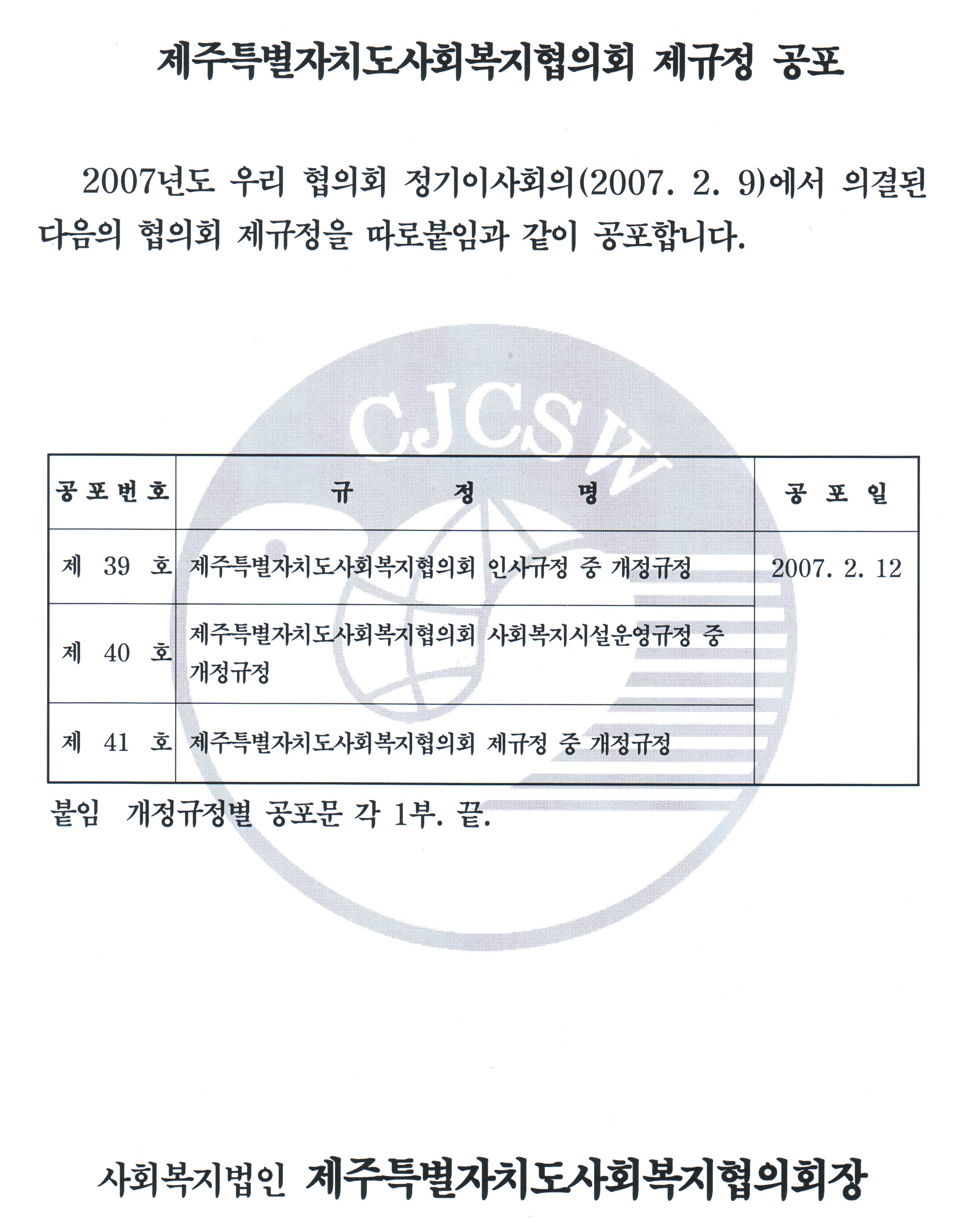 제주특별자치도사회복지협의회 제규정 공포