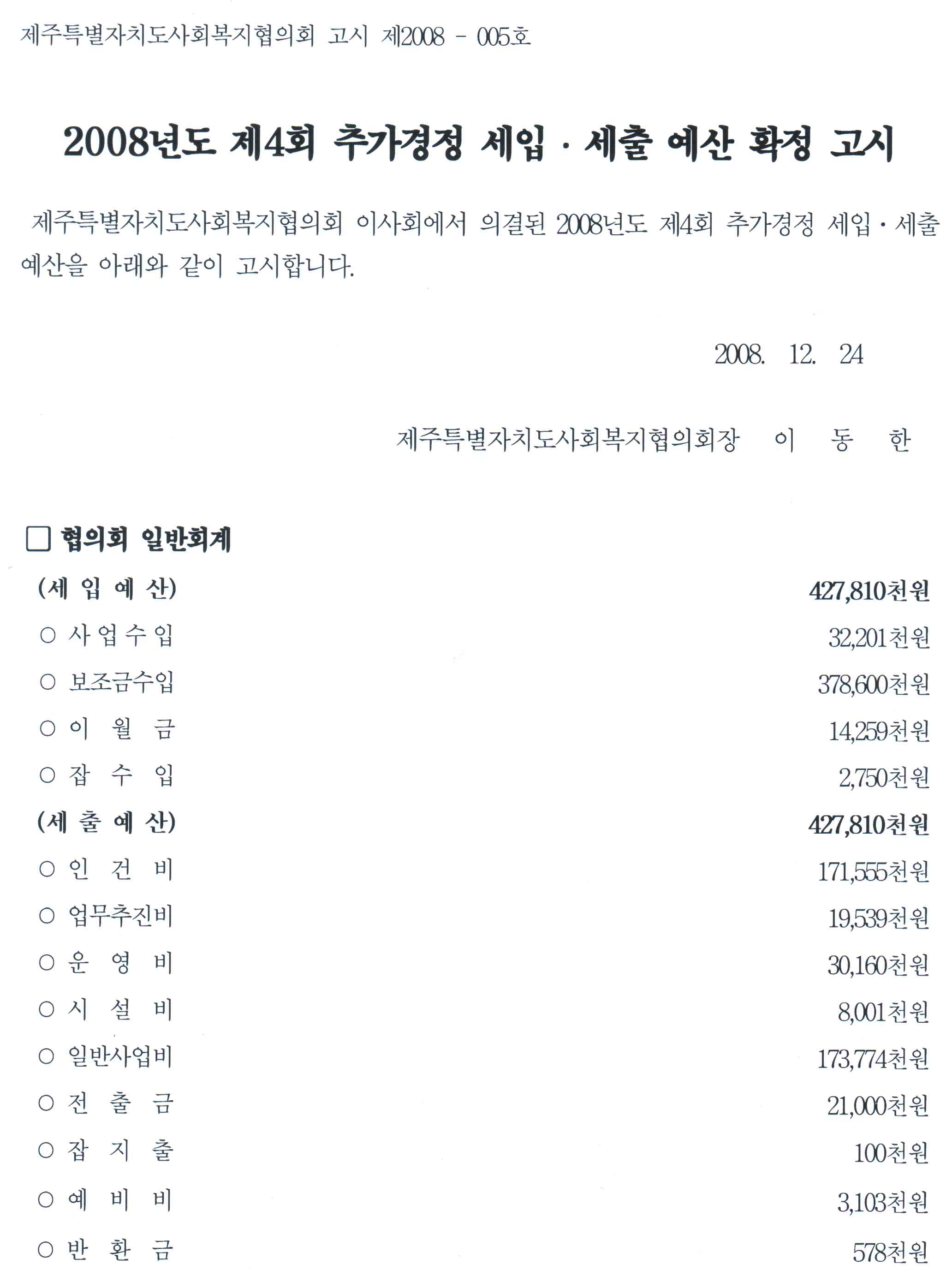2008년도 제4회 추가경정 세입·세출예산 확정 고시