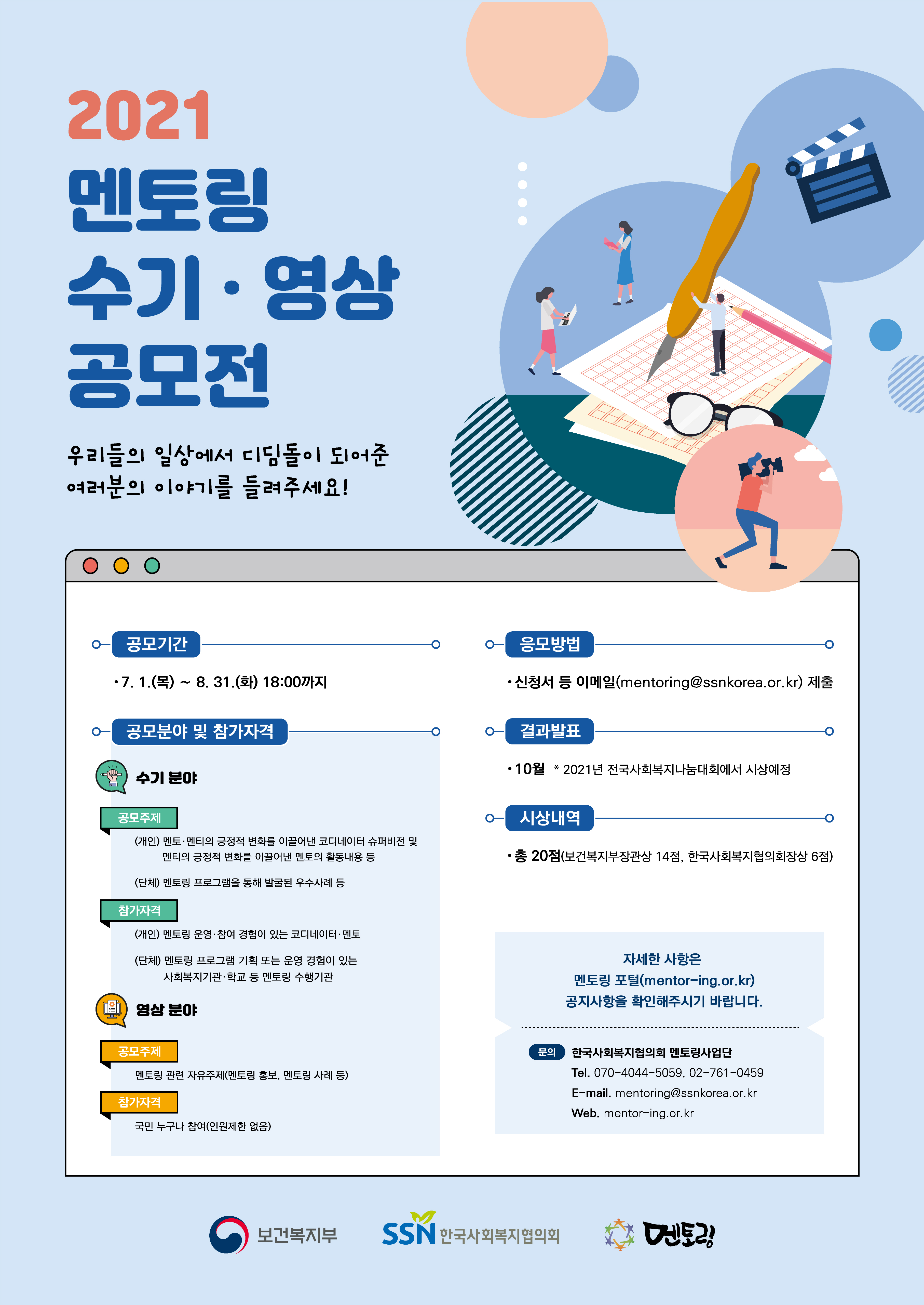 한국사회복지협의회에서 멘토링 사업 참여 확산 및 참여자의 사기진작을 위해 아래와 같이 공모전을 진행하오니 귀 시설·단체에서 활동하고 있는 개인 및 단체에 많은 홍보 부탁드립니다.