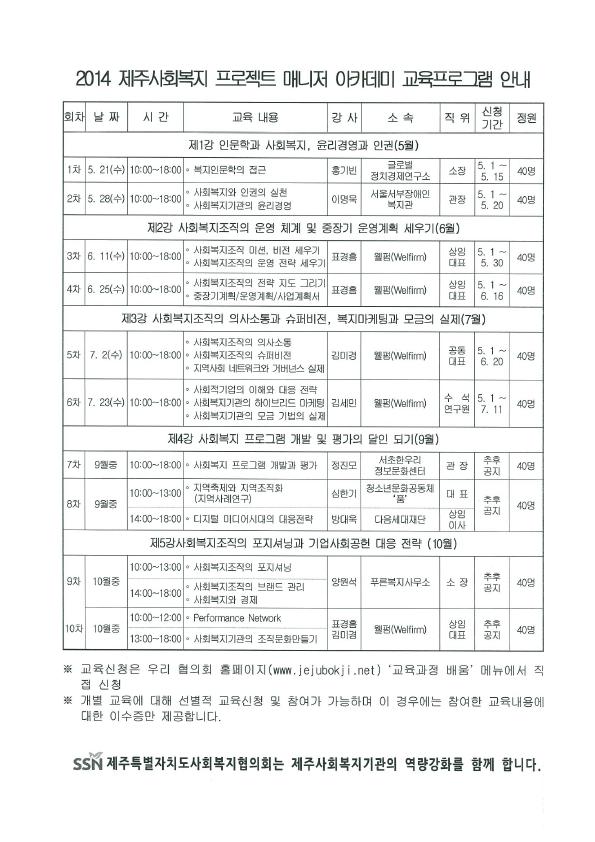 '2014 제주사회복지 프로젝트 매니저 아카데미' 교육프로그램을 마련하여 시행할 계획이오니 많은 참여바랍니다.