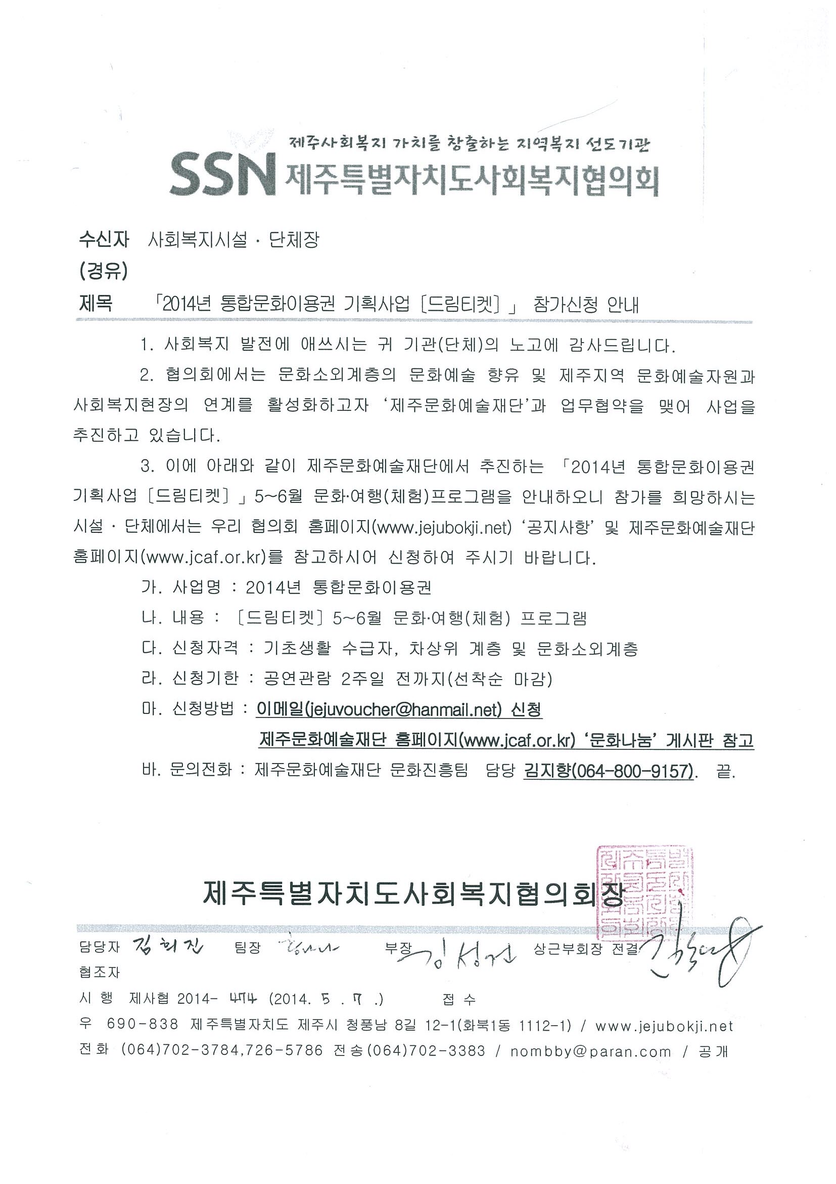 우리 협의회에서는 문화소외계층의 문화예술 향유 및 제주지역 문화예술자원과 사회복지현장의 연계를 활성화하고자 '제주문화예술재단'과 업무협약을 맺어 사업을 추진하고 있습니다.