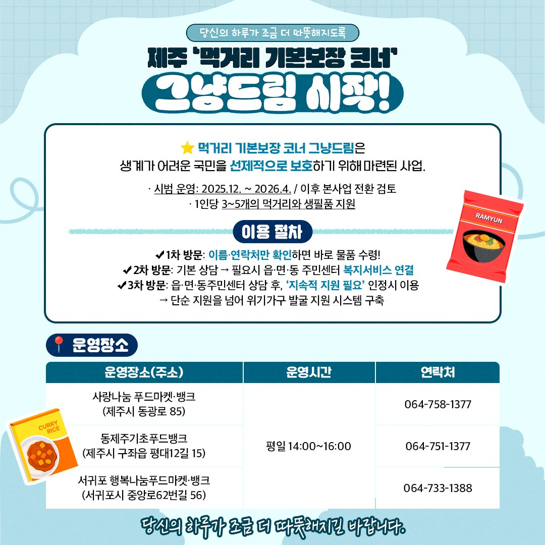 ❍ 지원대상 : 생계유지가 어려운 제주도민 (주소지와 가까운 사업장 방문시 바로 이용 가능)