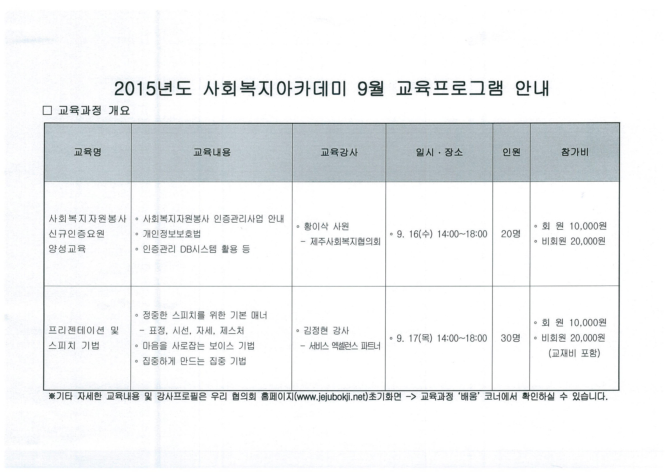 2015년도 사회복지아카데미 9월 교육프로그램을 마련하여 시행할 계획이오니