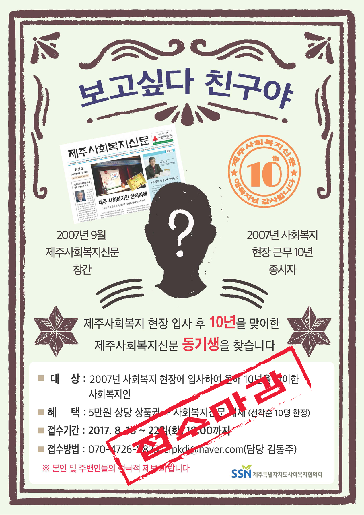 '제주사회복지신문 동기생을 찾습니다' 모집이 10명의 신청자가 접수되어 마감됨을 알려드립니다.