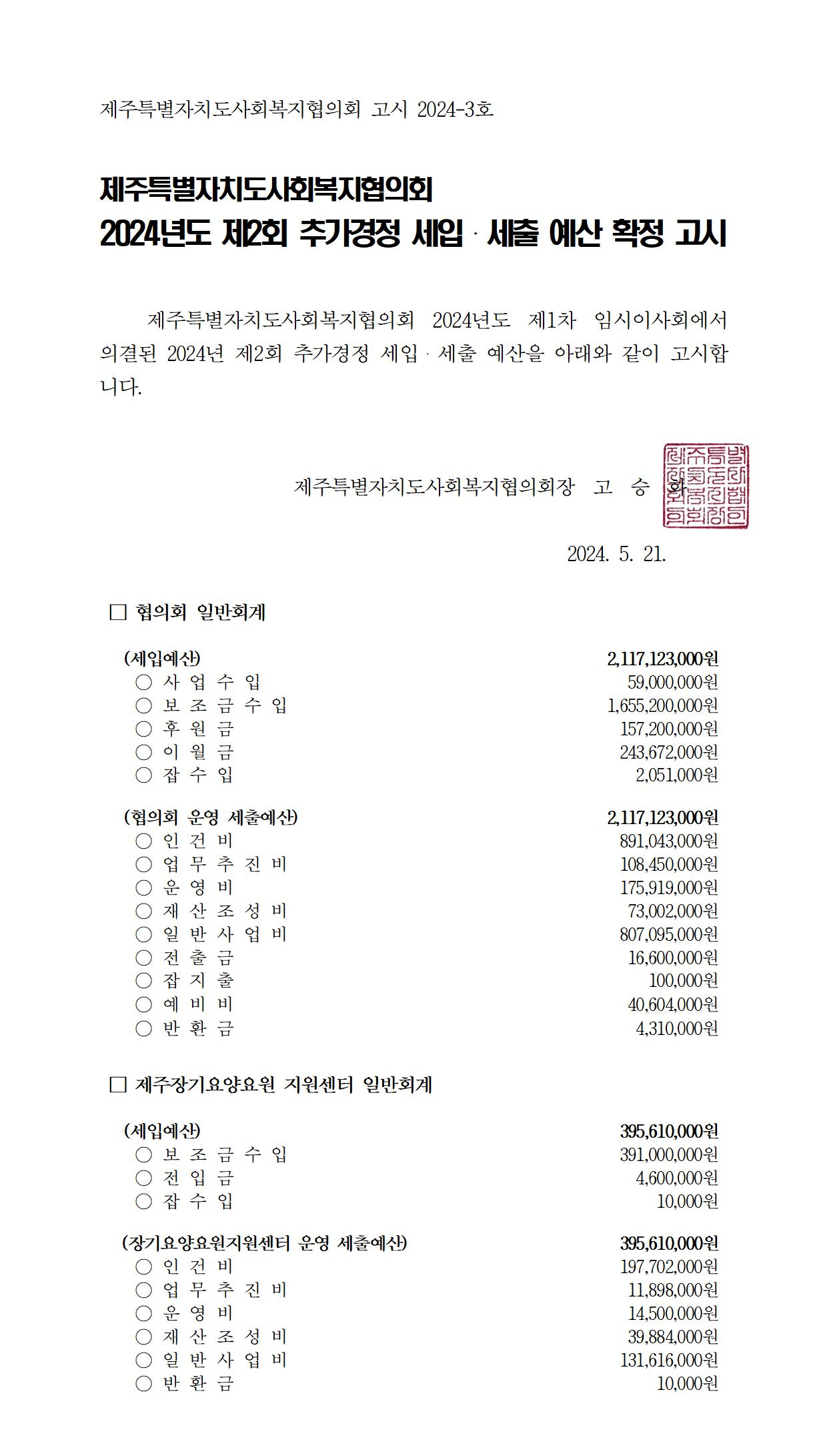 2024년도 제2회 추가경정 세입세출 예산고시