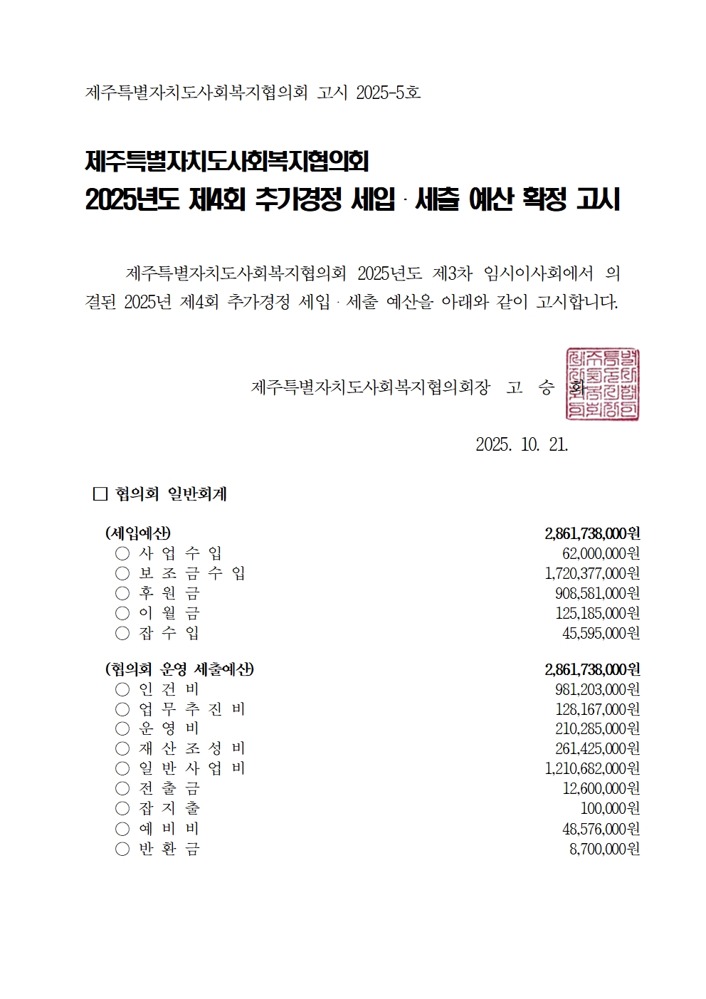 2025년도 제4회 추가경정 세입세출 예산고시