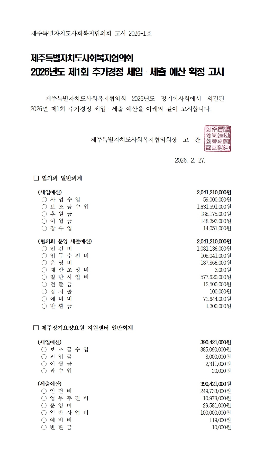 2026년도 제1회 추가경정 세입세출 예산고시