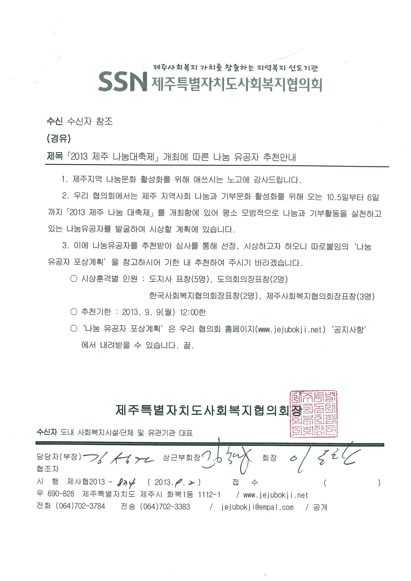 2013 제주 나눔 대축제 개최에 따른 나눔 유공자 추천 안내