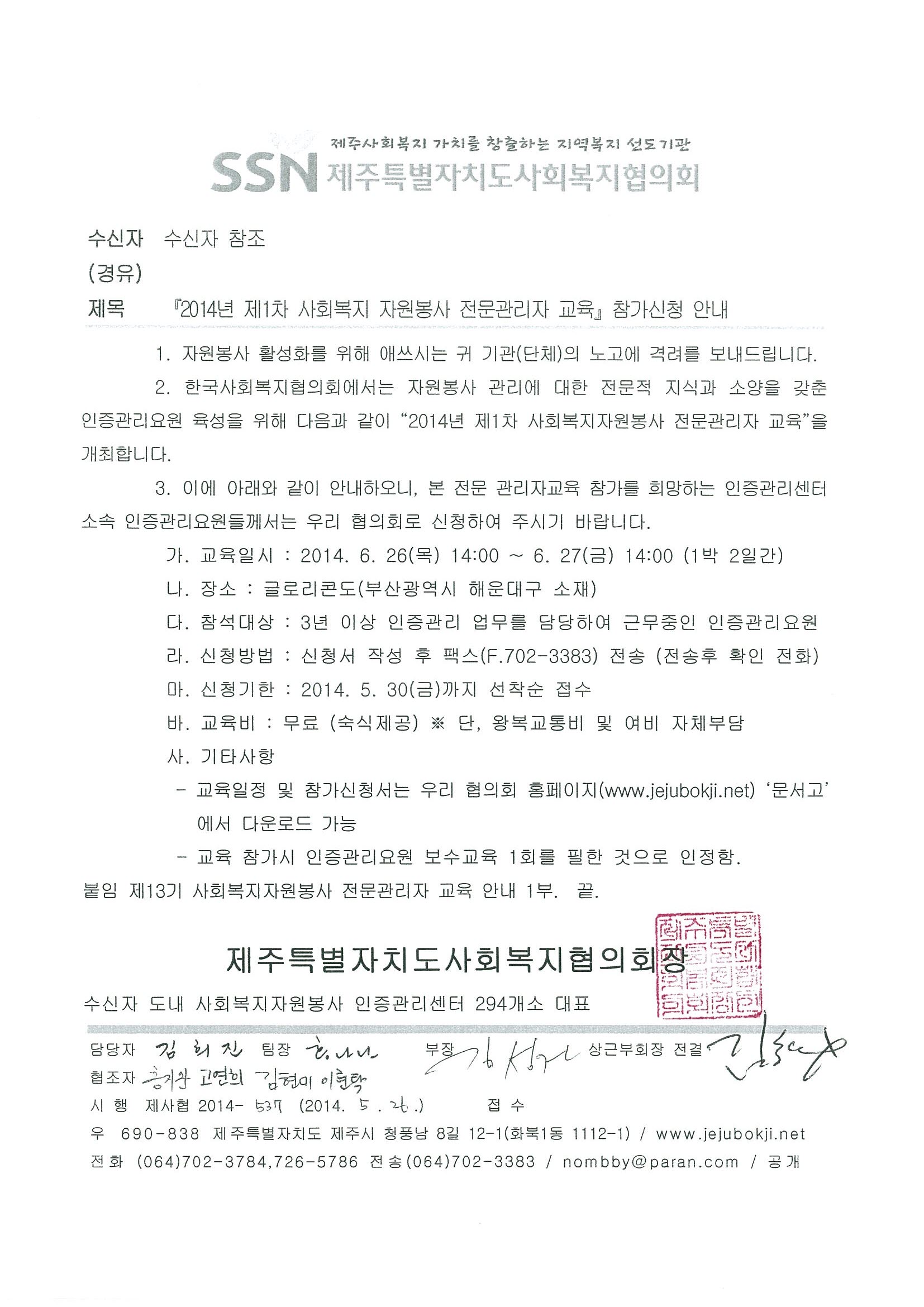 2014년 제1차 사회복지자원봉사 전문관리자교육 참가신청 안내