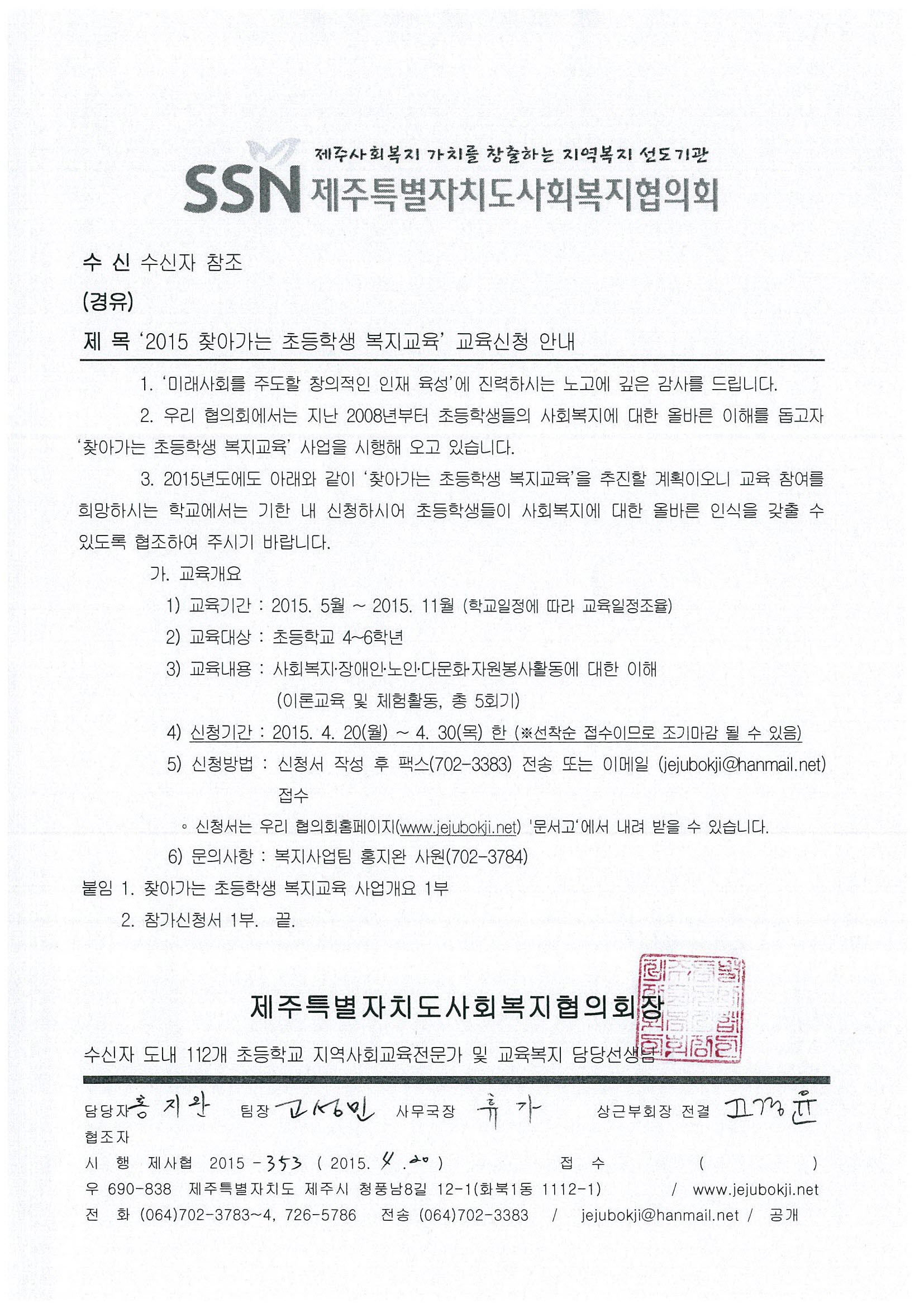 '2015년도 찾아가는 초등학생 복지교육' 교육신청 안내