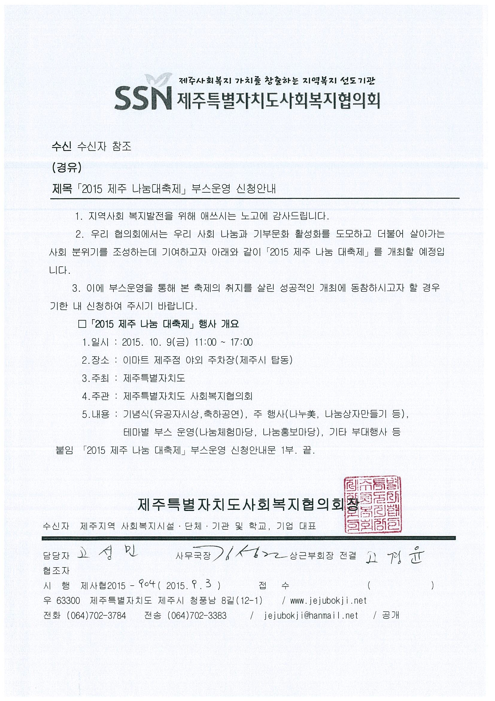 「2015 제주 나눔 대축제」부스운영 신청안내
