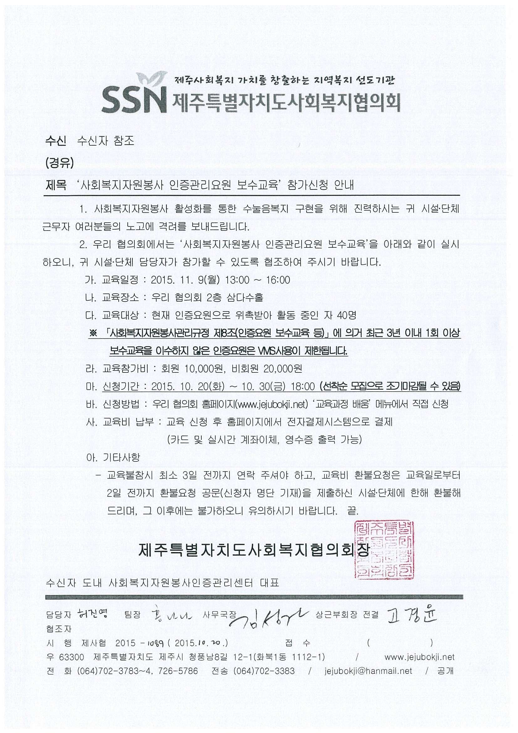 2015년도 사회복지자원봉사 인증관리요원 보수교육(하반기) 참가신청 안내