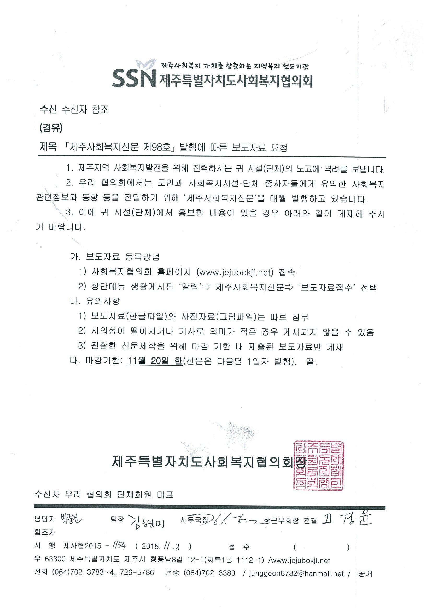 제주사회복지신문 98호 보도자료 요청공문