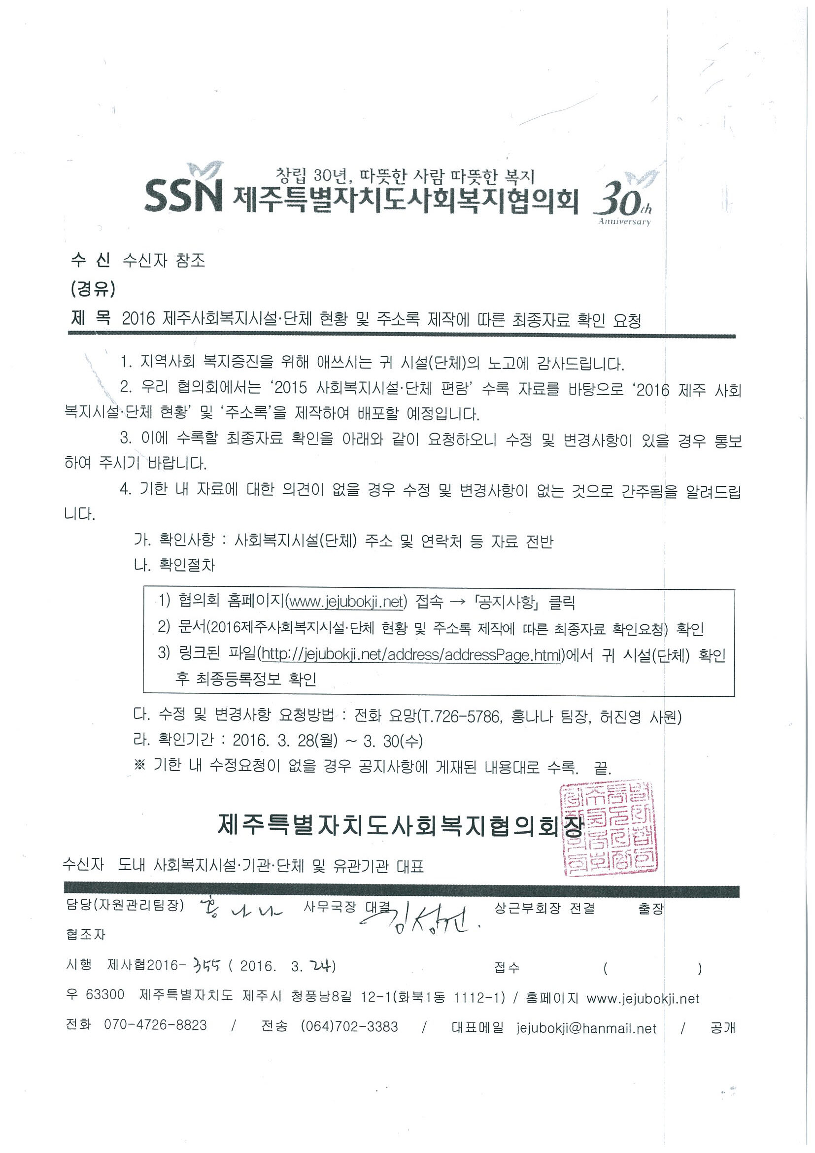 2016 제주사회복지시설·단체 현황 및 주소록 제작에 따른 최종자료 확인 요청 공문