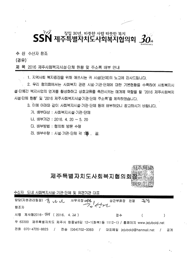2016 제주사회복지시설·단체 현황 및 주소록 배부 안내