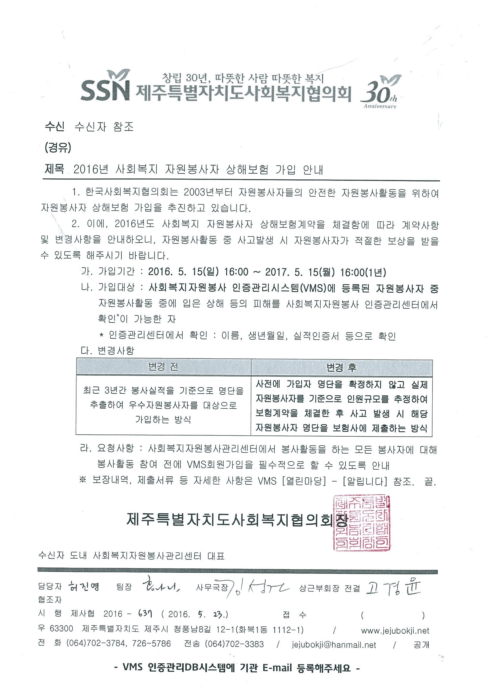 2016년 사회복지 자원봉사자 상해보험 가입 안내