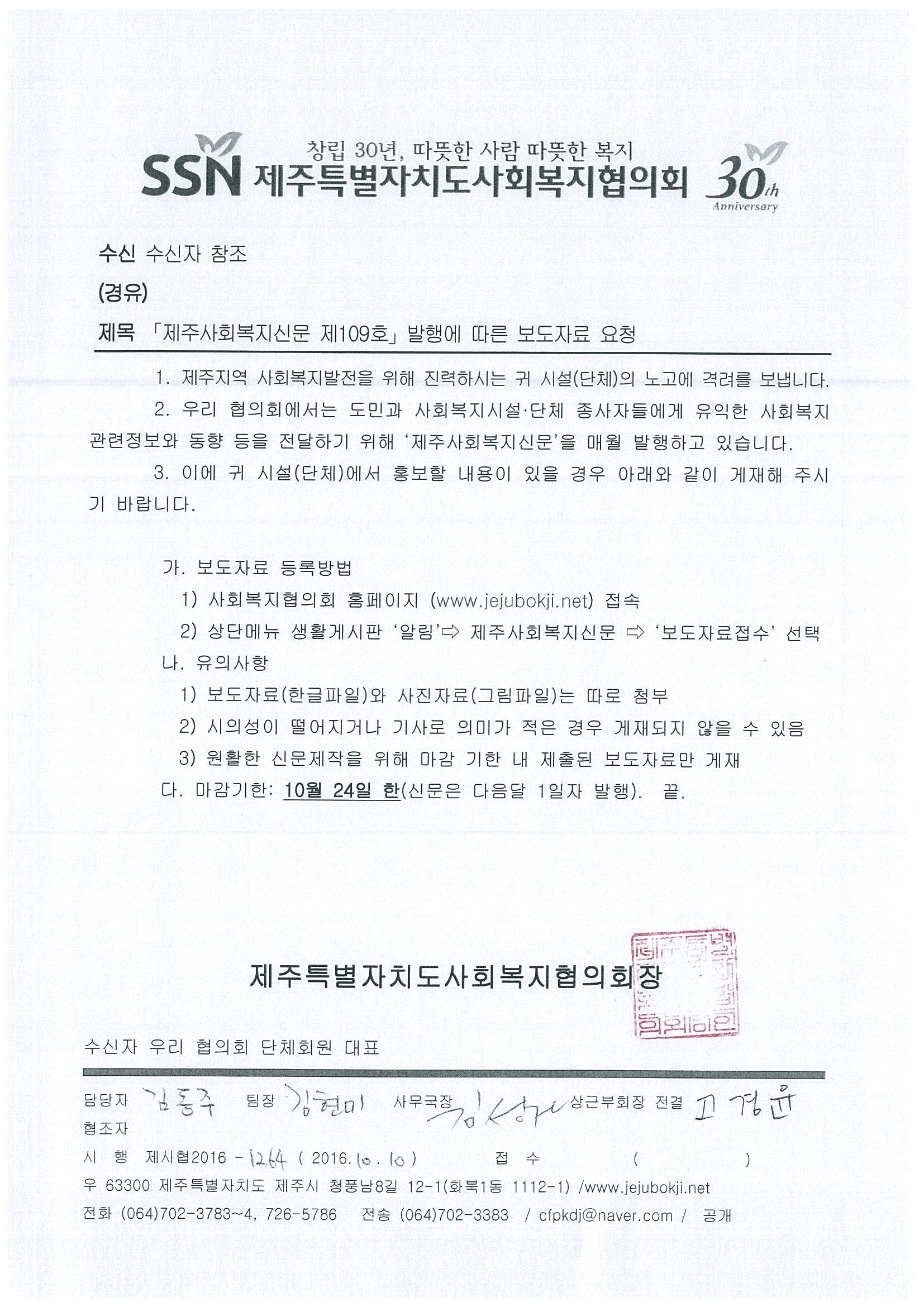 제주사회복지신문 109호 발행에 따른 보도자료 등록 안내 공문