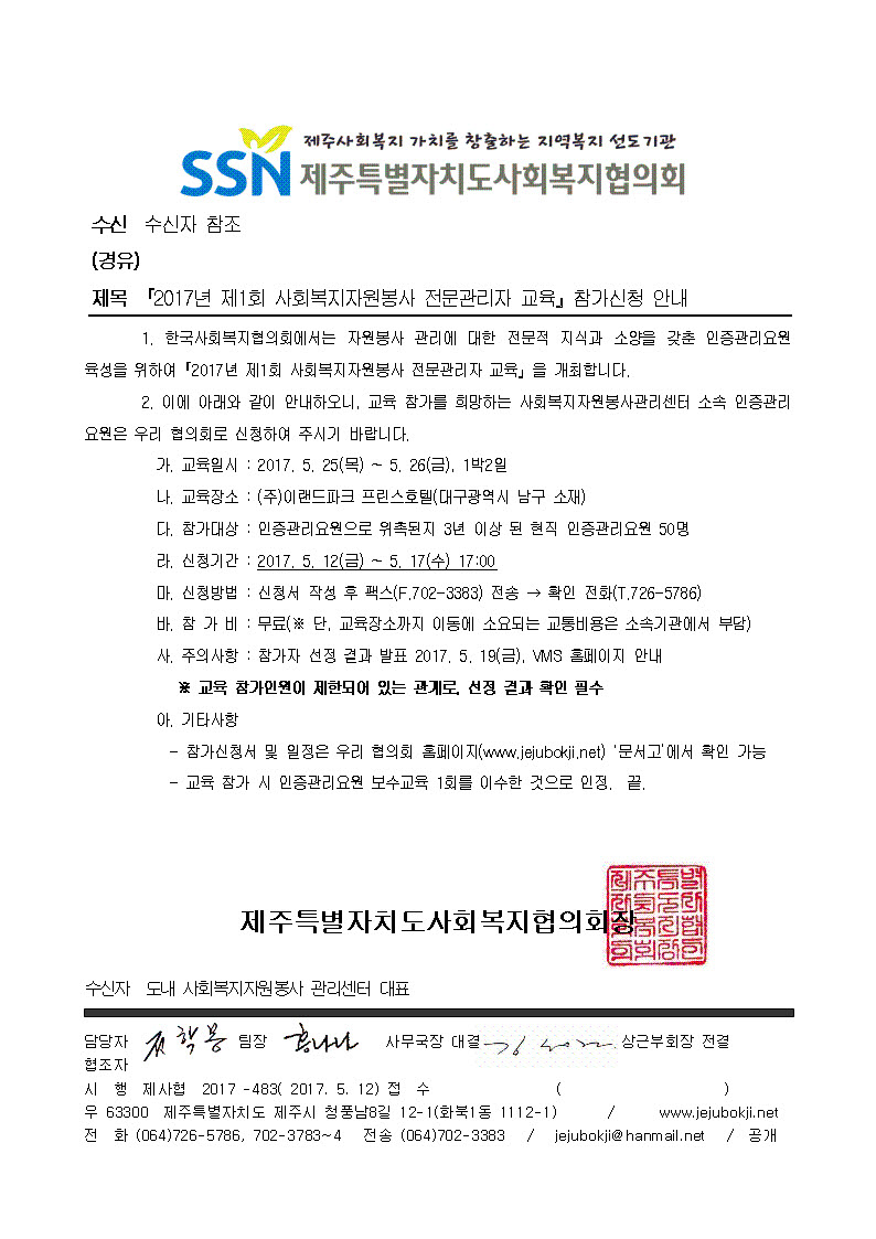 2017년 사회복지자원봉사 전문관리자 교육 참가신청 안내