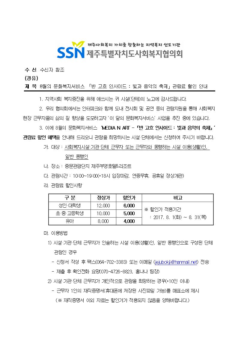 8월의 문화복지서비스 『반 고흐 인사이드 : 빛과 음악의 축제』관람료 할인 안내