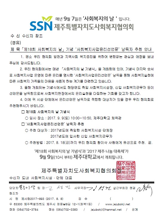 「제18회 사회복지의 날」기념 '사회복지사업윤리선언문' 낭독자 추천 안내