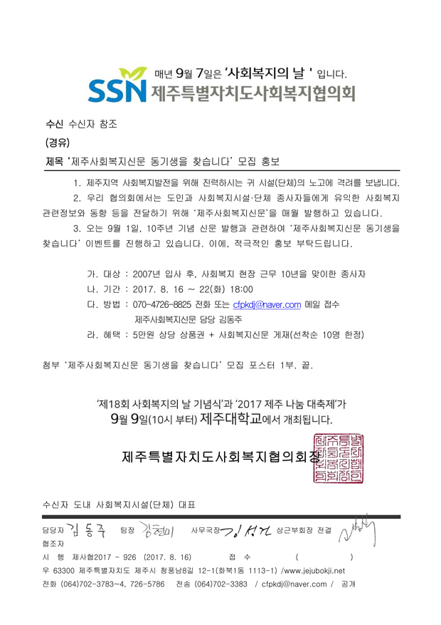 '제주사회복지신문 동기생을 찾습니다' 모집 홍보