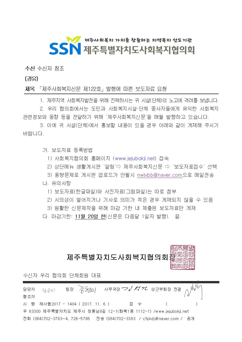 「제주사회복지신문 제122호」발행에 따른 보도자료 요청