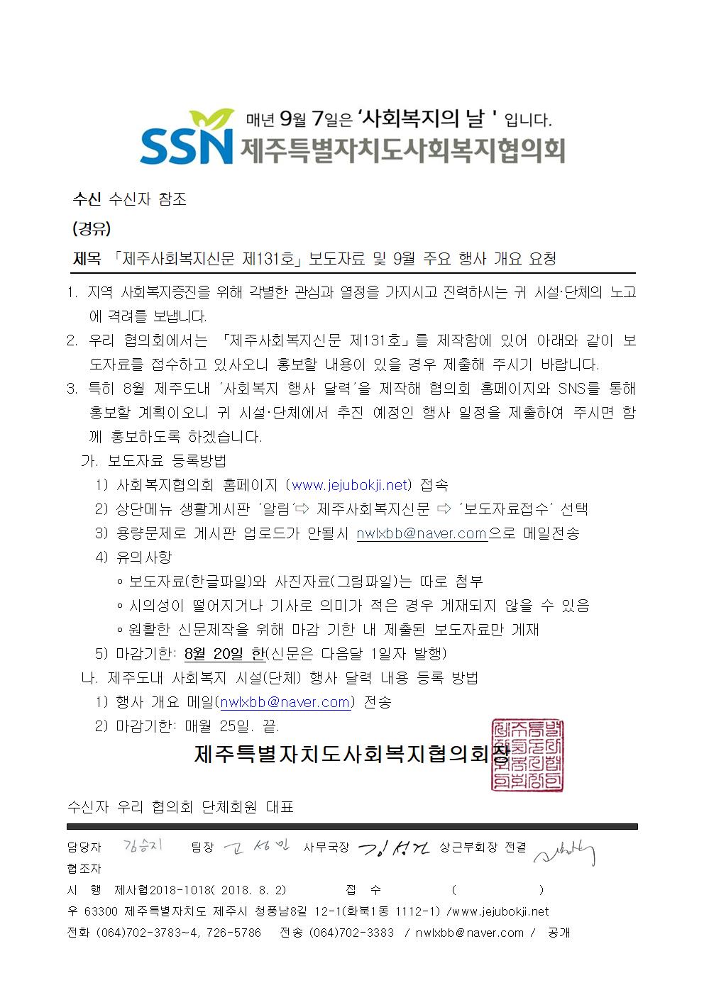 「제주사회복지신문 제131호」발행에 따른 보도자료 요청