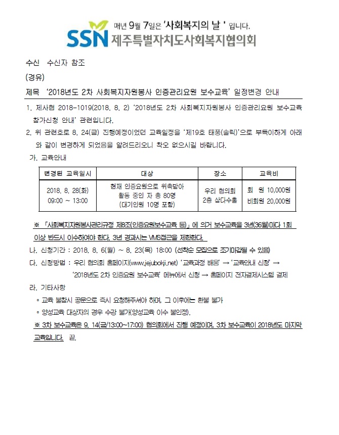 2018년도 2차 사회복지자원봉사 인증관리요원 보수교육 일정변경 안내