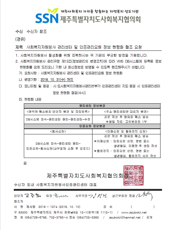 사회복지자원봉사 관리센터 및 인증관리요원 정보 현행화 협조 요청